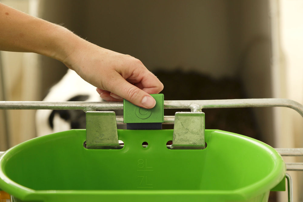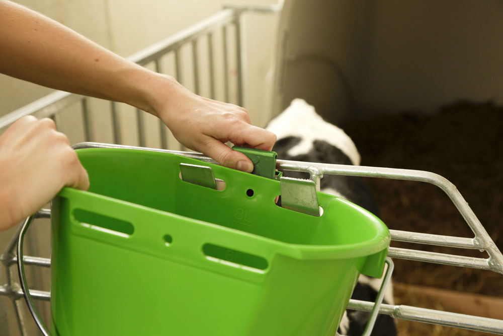 Durch die Auswurfsicherung kann das Tier den Tränkeeimer nicht aus der Eimerhalterung werfen.