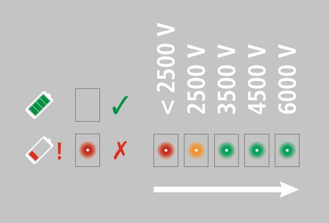 - mehrfarbige LED-Bargraphanzeige für Ausgangsspannung und Batteriekontrolle