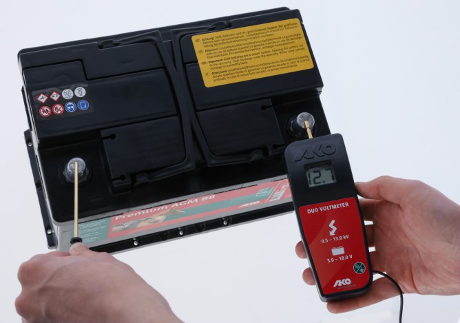 Digitaler AKO "All-in-One" DUO-Voltmeter prüft die Spannung von Weidezaungeräten, Elektrozäunen und 9 Volt Batterien bzw. 12 Volt Akkus.