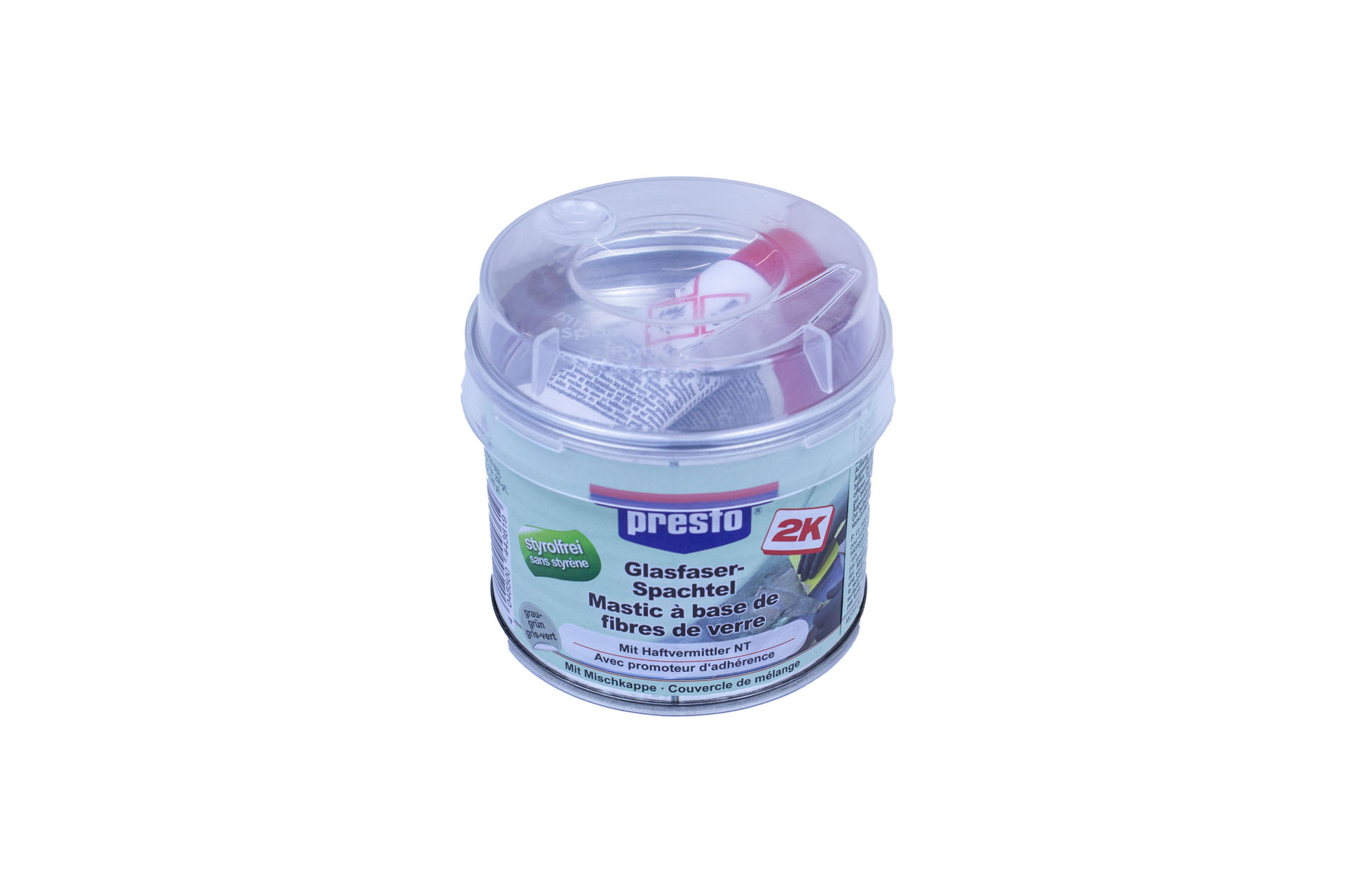 Glasfaserspachtel "styrolfrei" ist ein zweikomponentiger Polyesterspachtel und enthält den Haftvermittler NT. Der Spachtel besteht aus reinem, ungesättigtem Polyesterharz und Glasfaserteilen.