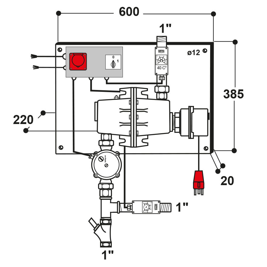 Das Gerät ist auf einer Grundplatte vormontiert. Die Wasser-Anschlüsse sind in 1" ausgeführt.