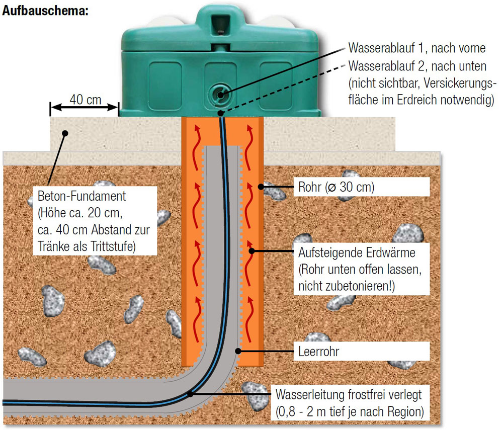 Um den Frostschutz zu gewährleisten, muss die Tränke auf einem Fundament mit einem eingelassen Rohr (Ø 30 cm) montiert werden. (siehe Aufbauschema)