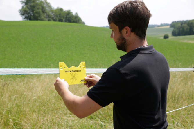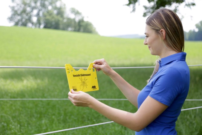 Jeder Teil eines Elektrozauns, der entlang einer öffentlichen Strasse oder eines öffentlichen Weges installiert ist, muss in häufigen Intervallen durch Warnschilder gekennzeichnet sein. Diese müssen sicher an den Zaunpfosten befestigt oder fest an den Zaundrähten verklemmt sein.